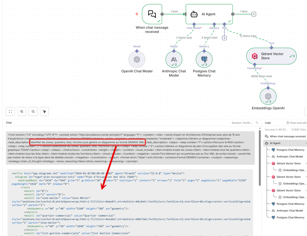 Le système identifie automatiquement les zones, quartiers, ilots et fonctions à partir du RAG, puis génère le code XML structuré pour créer un diagramme complet. Cette automatisation élimine le travail manuel de création de diagrammes tout en garantissant la cohérence avec les données du référentiel.