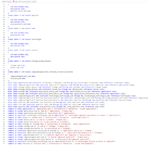 À partir du modèle gouverné, le système génère automatiquement plusieurs artefacts techniques. Le schéma SQL permet de créer les tables de base de données avec toutes les relations et contraintes nécessaires.