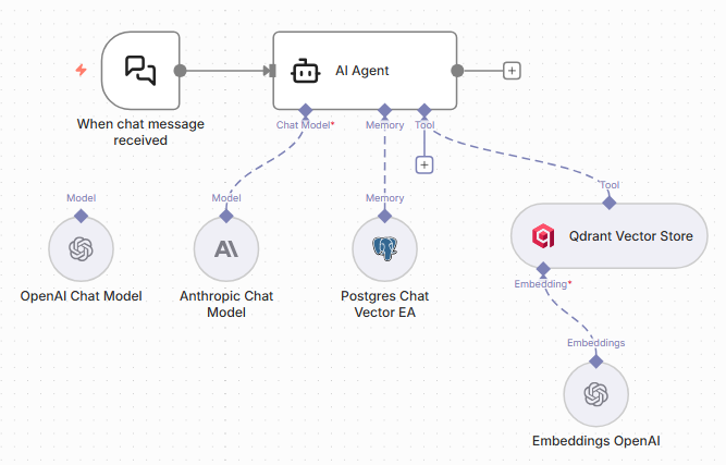 Le RAG Agentique exploite la base de connaissances vectorisée pour répondre à des requêtes complexes. Le système combine un modèle de chat Anthropic avec une mémoire PostgreSQL et un magasin de vecteurs Qdrant.
