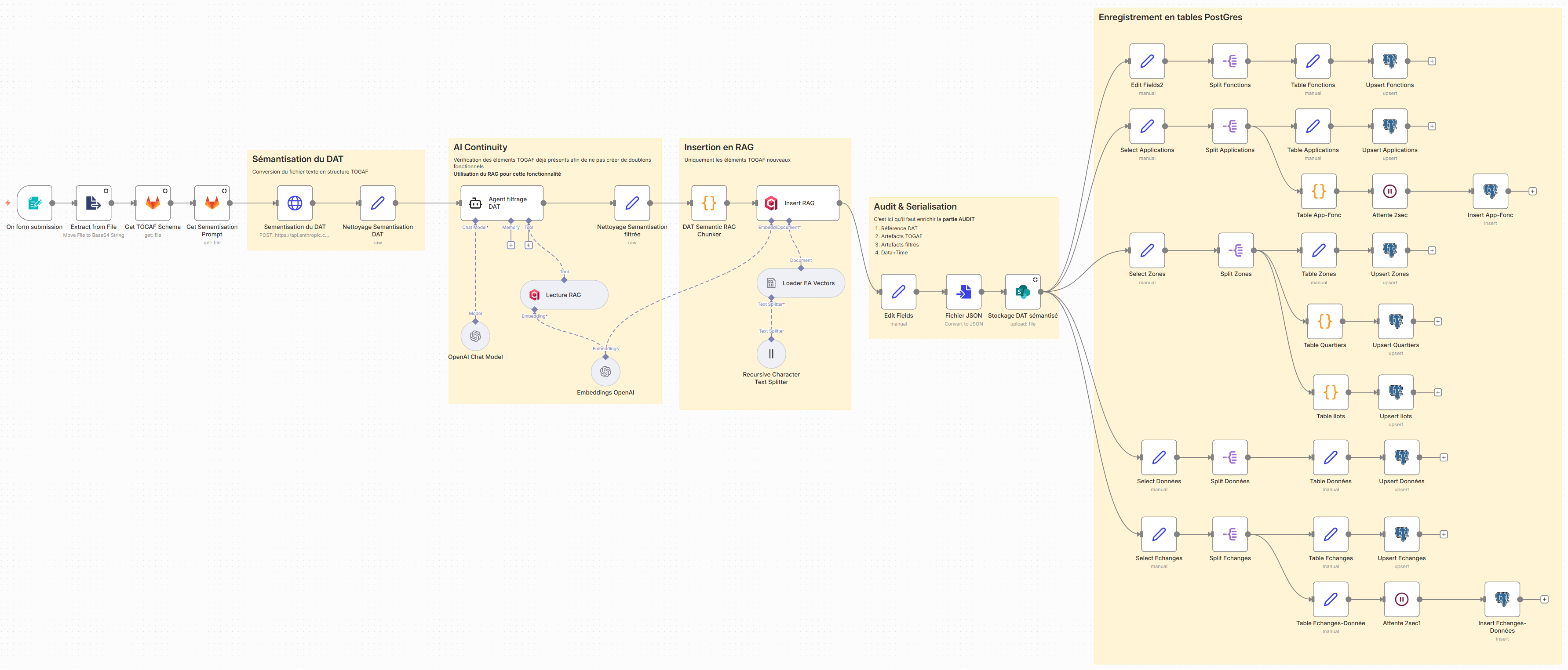 Le workflow complet d'acquisition du DAT démontre l'orchestration des différentes étapes. La sémantisation du DAT convertit le fichier texte en structure TOGAF. L'AI Continuity vérifie les éléments TOGAF déjà présents afin de ne pas créer de doublons fonctionnels.