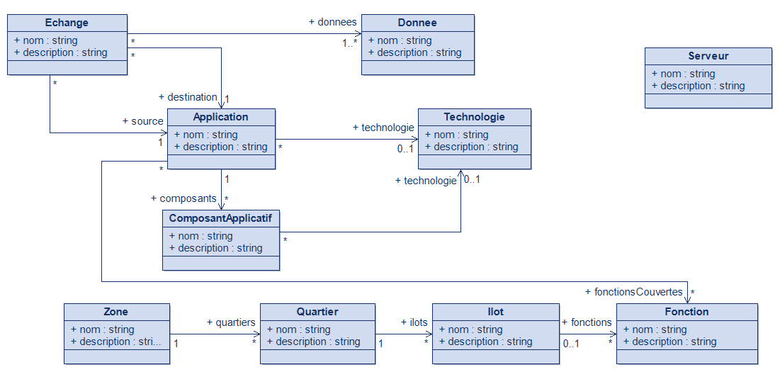 Les flux de données sont modélisés via les Échanges et les Données échangées. L'organisation spatiale du système d'information est représentée par une hiérarchie Zone, Quartier, Ilot, Fonction qui permet de cartographier le plan d'occupation des sols applicatif.