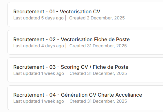 Chez Acceliance, dans le domaine RH, nous avons automatisé le processus de recrutement de nos consultants sur mission. Deux RAG pré-vectorisés nous permettent d'effectuer des requêtes de grande précision.