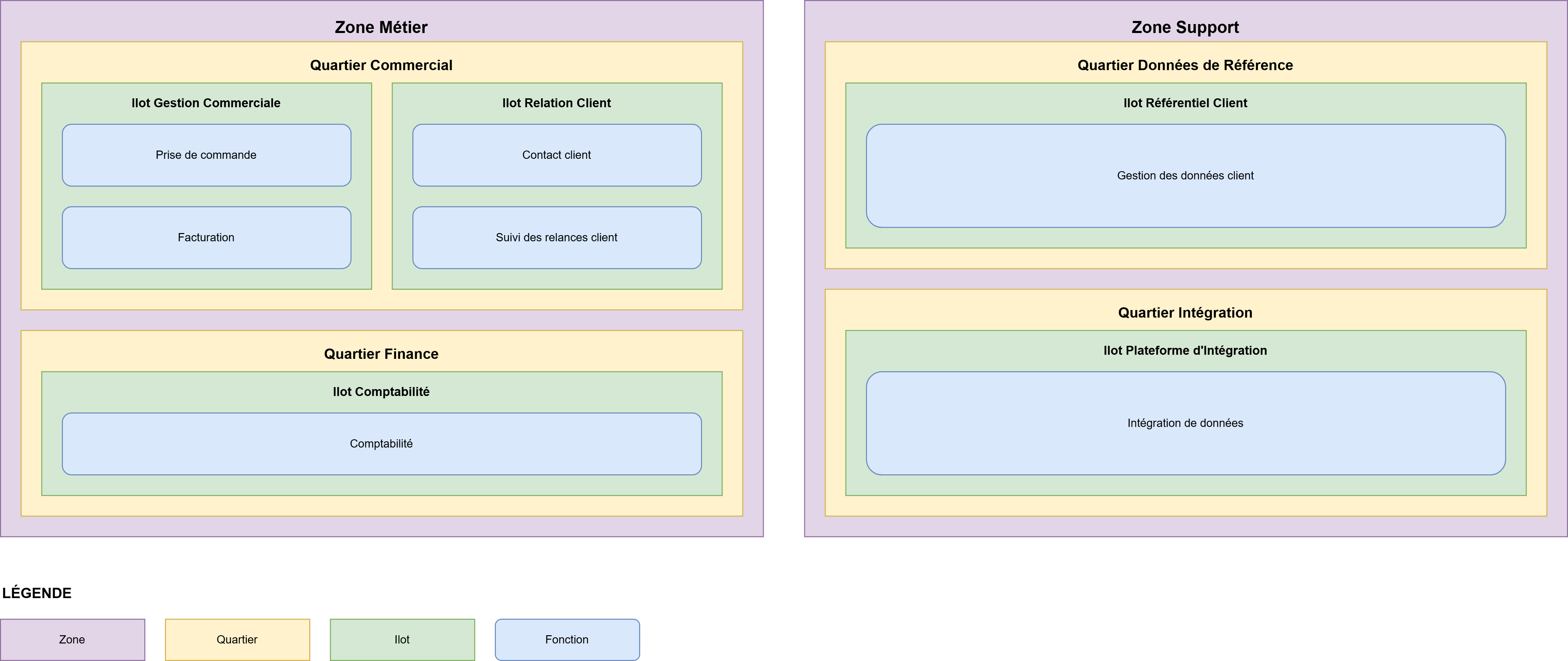La Zone Support comprend le Quartier Données de Référence avec l'Ilot Référentiel Client, ainsi que le Quartier Intégration avec l'Ilot Plateforme d'Intégration. Chaque fonction métier (Prise de commande, Facturation, Contact client, etc.) est positionnée dans son ilot.
