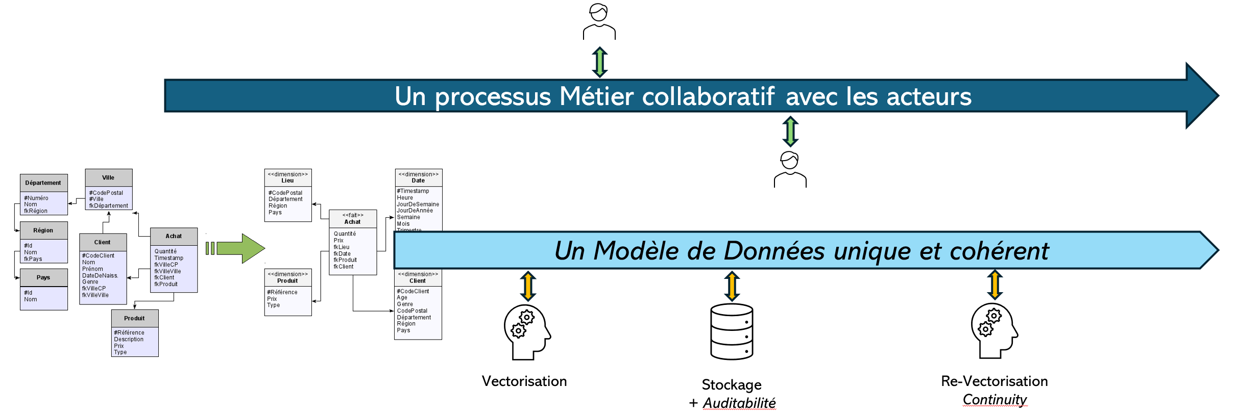 Le workflow comprend trois phases principales : la vectorisation qui transforme les données en représentations sémantiques, le stockage avec auditabilité intégrée pour garantir la traçabilité, et la re-vectorisation pour assurer la continuité lors des mises à jour du système.