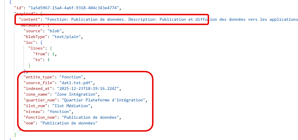 Chaque élément stocké contient son contenu sémantique ainsi que des métadonnées riches : type d'entité, fichier source, date d'indexation, localisation dans la hiérarchie zone/quartier/ilot, niveau et nom de fonction. Ces métadonnées permettent des recherches contextuelles précises.