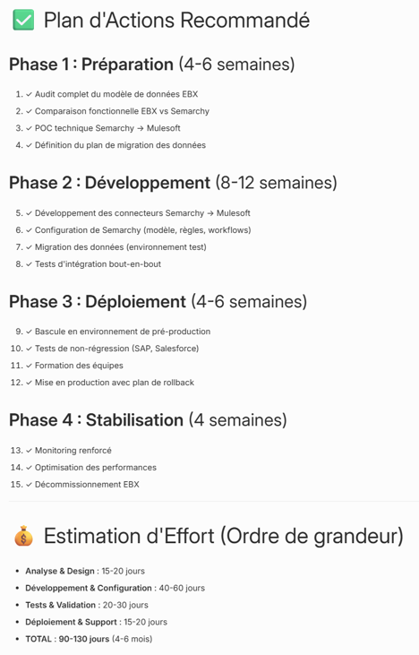 Le plan d'actions recommandé structure le projet de migration en quatre phases. La Phase 1 de Préparation (4-6 semaines) comprend l'audit du modèle de données EBX, la comparaison fonctionnelle EBX vs Semarchy, le POC technique Semarchy/Mulesoft et la définition du plan de migration.