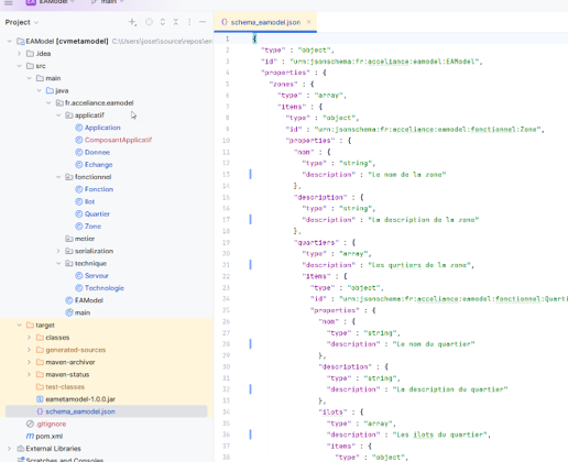 Un schéma JSON est également généré pour permettre l'interopérabilité avec les systèmes modernes. Les classes Java peuvent être produites pour intégrer le modèle dans des applications d'entreprise existantes.