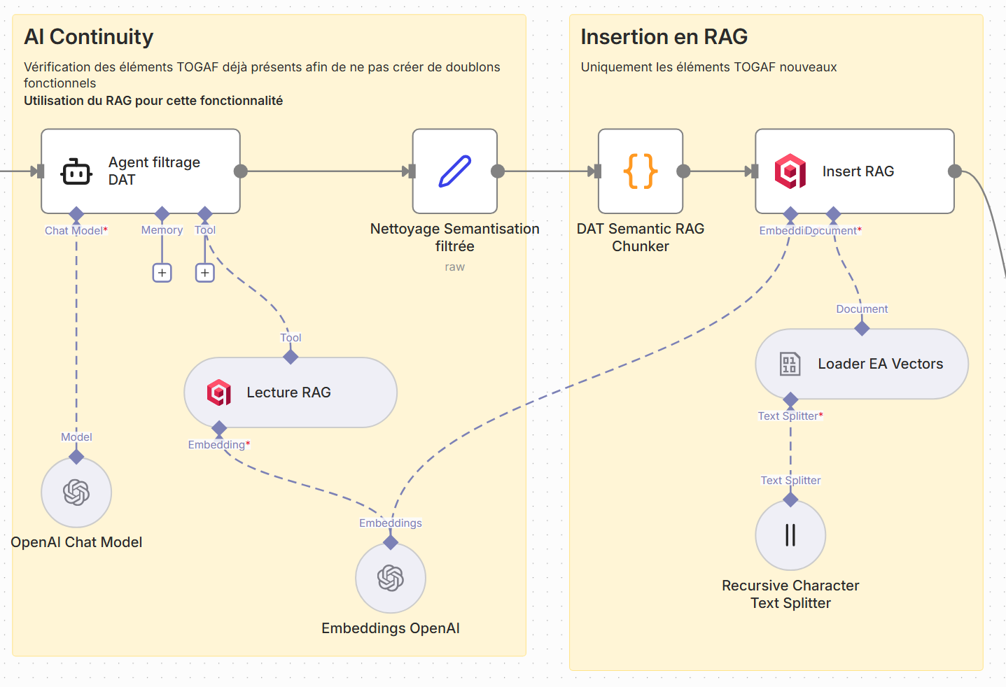 Le workflow complet d'acquisition du DAT démontre l'orchestration des différentes étapes. La sémantisation du DAT convertit le fichier texte en structure TOGAF. L'AI Continuity vérifie les éléments TOGAF déjà présents afin de ne pas créer de doublons fonctionnels.