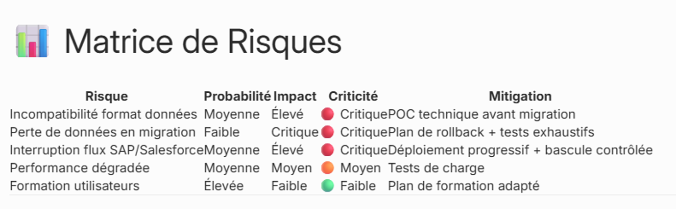 La criticité résultante permet de prioriser les actions de mitigation. Les mesures proposées sont concrètes : POC technique avant migration, plan de rollback avec tests exhaustifs, déploiement progressif avec bascule contrôlée, tests de charge, plan de formation adapté.