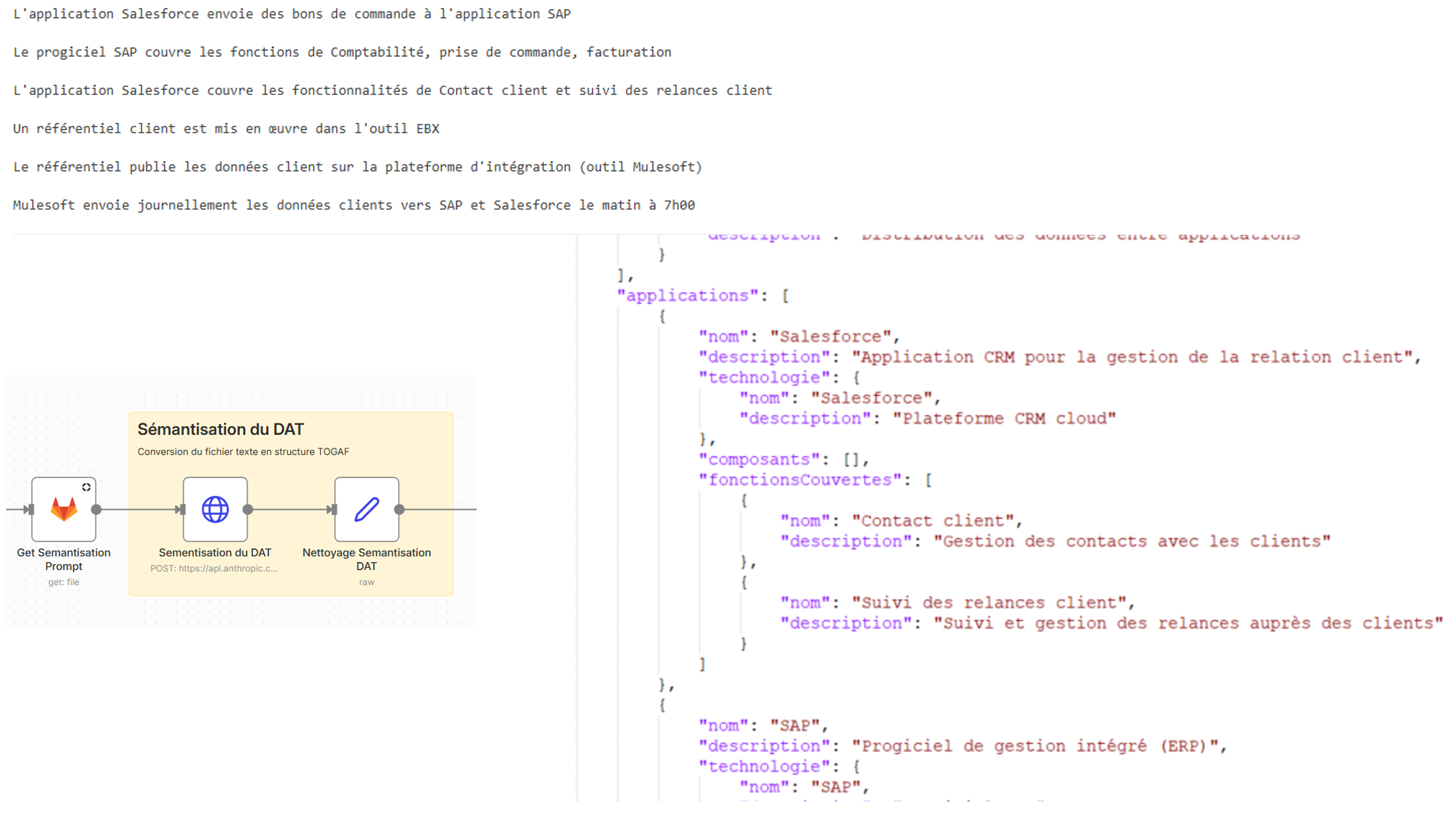 La sémantisation transforme le texte libre en données structurées. À partir de phrases naturelles décrivant l'architecture (par exemple : « L'application Salesforce envoie des bons de commande à l'application SAP »), le système extrait automatiquement les entités et leurs relations.