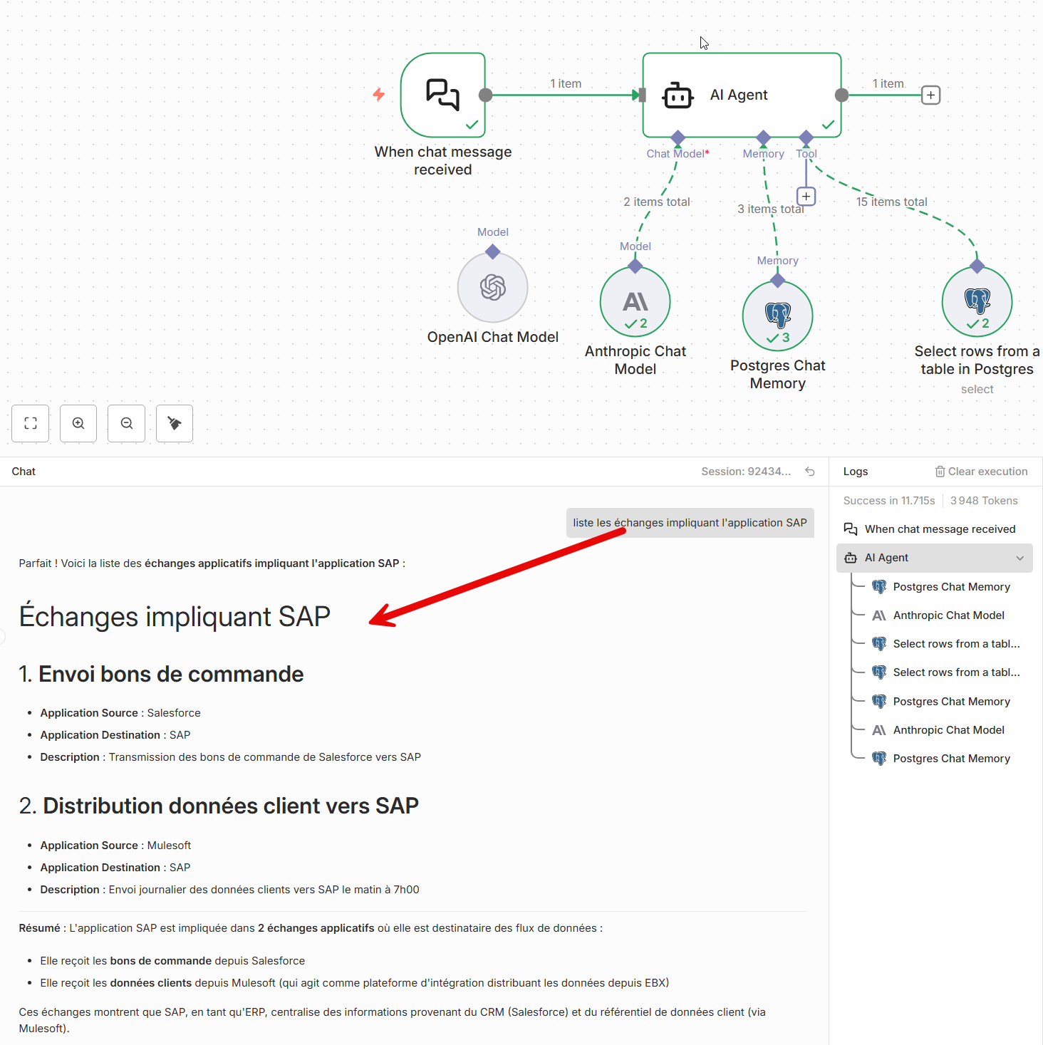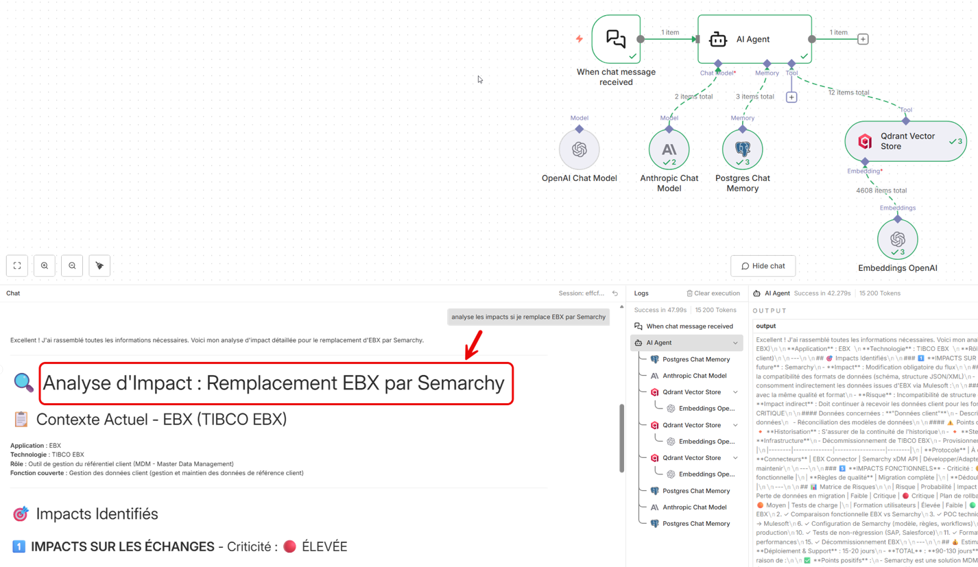 Le RAG Agentique exploite la base de connaissances vectorisée pour répondre à des requêtes complexes. Le système combine un modèle de chat Anthropic avec une mémoire PostgreSQL et un magasin de vecteurs Qdrant.